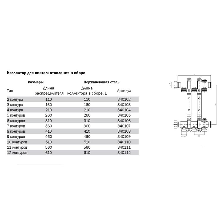 Коллектор для систем отопления без вентилей в сборе, 1'' x 3/4'' евроконус, нержавеющая сталь, круглое сечение, 12 контуров.